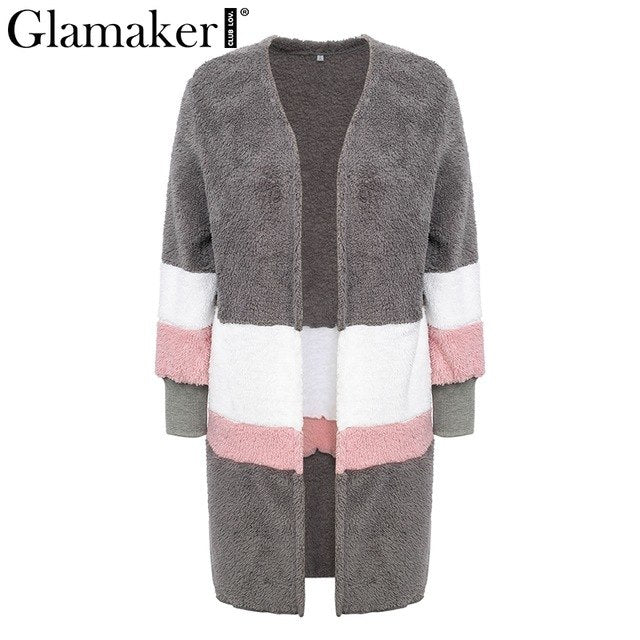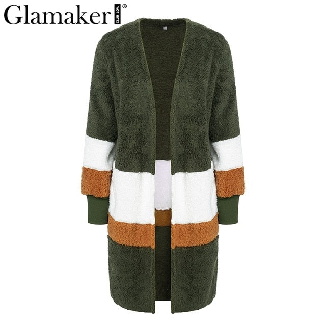 Glamaker Fluffy patchwork warm faux fur jacket Winter long sleeve plush teddy coat with fur Soft v neck casual autumn teddy coat