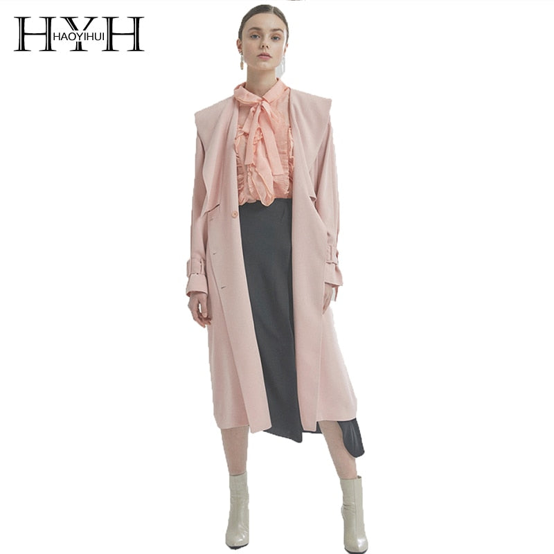 HYH HAOYIHUI Elegant Shawl Collar Double-breasted Belt Ladies Coat Long Solid Color Rear Slit Windbreaker