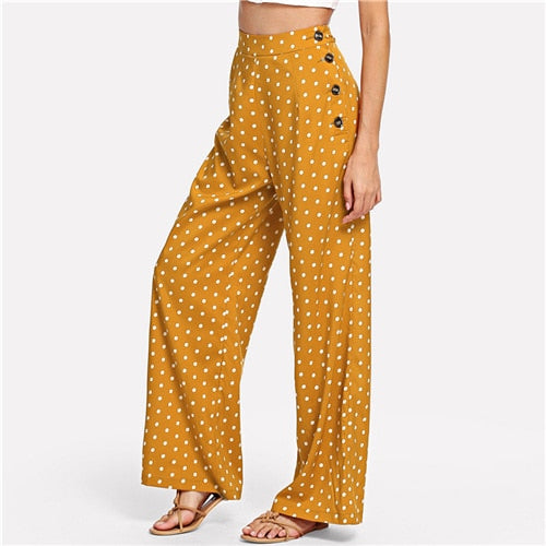 SHEIN Ginger Polka Dot Side Button Wide Leg Pants Casual High Waist Button Fly Trousers Women Long Pants For Summer Autumn