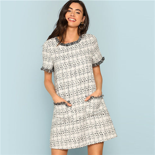 SHEIN Grey Plaid Frayed Edge Button Detail Tweed Dress Elegant Frill Straight Short Dresses Women Autumn Workwear Mini Dress