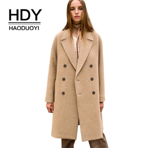 HDY haoduoyi Simple Temperament Commuter Basic Outcoats Flip Collar Double-breasted Camel Long Coat