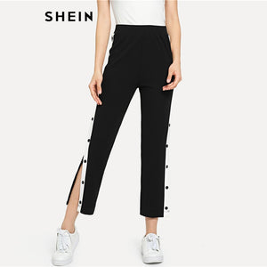 SHEIN Black Colorblock Contrast Snap Button Side Pants Casual High Waist Crop Trousers Women Autumn Stretchy Athleisure Pants
