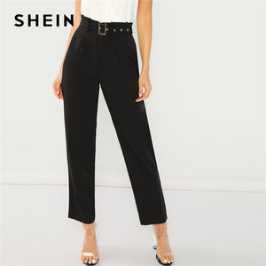 SHEIN Black Elegant Office Lady Pleated Tailored Buckle Belted Solid Minimalist Pants 2018 Autumn Casual Workwear Trousers