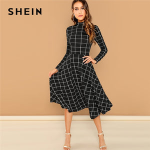 SHEIN Black Elegant Plaid Print High Neck Fit And Flare Long Sleeve High Waist Dress 2018 Autumn Casual Women Long Dresses
