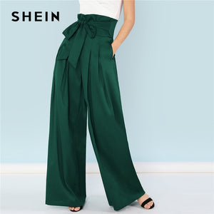 SHEIN Green Elegant Office Lady Self Belted Box Pleated Palazzo High Waist Minimalist Wide Leg Pants 2018 Autumn Casual Trousers