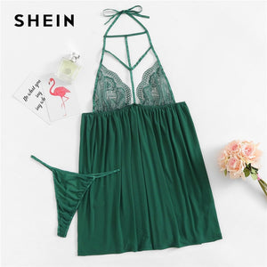 SHEIN Green Eyelash Lace Trim Mesh Halter Top With Panty Sleep Set Sexy Cut Out Sheer Knot Sleepwear Women Autumn Nightwear