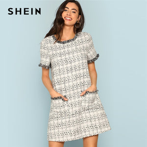 SHEIN Grey Plaid Frayed Edge Button Detail Tweed Dress Elegant Frill Straight Short Dresses Women Autumn Workwear Mini Dress