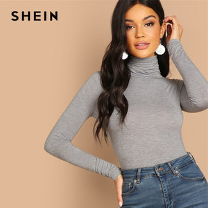SHEIN Grey Elegant Turtleneck High Neck Stretchy Slim Fit Plain T-shirt 2018 Autumn Casual Workwear Women Tops And T shirt