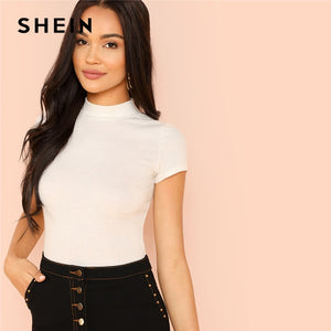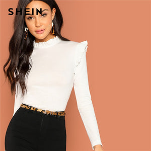 SHEIN Modern Lady White Slim Fit Frill Trim Solid Stand Collar Long Sleeve Pullovers Tee 2018 Autumn Campus Women Tshirt Top