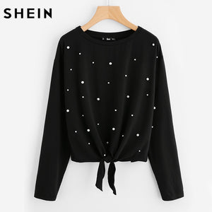 SHEIN Pearl Beaded Knot Front Cute Tee Shirt Black Casual T shirt for Women Long Sleeve Round Neck Women T-shirts