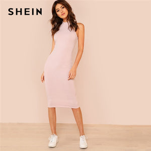 SHEIN Pink Mock Neck Rib Knit Plain Pencil Dress Women Stand Collar Sleeveless Slim Dress 2018 Elegant Going Out Bodycon Dress