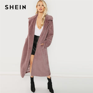 SHEIN Pink Office Lady Elegant Open Front Longline Faux Fur Teddy Solid Coat 2018 Autumn Minimalist Women Coats Outerwear