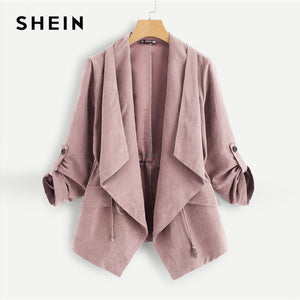 SHEIN Pink Pocket Front Drawstring Pleated Buttoned Sleeve Open Stitch Solid Trench Coat Casual Spring Women Coats Outerwear