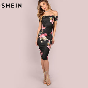 SHEIN Sexy Party Dresses Bodycon Off Shoulder Dress Black Bardot Neckline Floral Bodycon Knee Length Elegant Dress