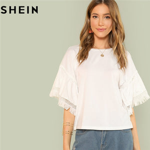 SHEIN White O Neck Contrast Lace Sleeve Woman Top Tee 2018 New Weekend Casual Fringe Detail Bell Sleeve Solid Stretchy T Shirt