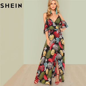 SHEIN Summer Boho Floral Print Sexy Deep V Neck Open Shoulder Maxi Dress Women Beach Vacation High Waist Surplice Wrap Dresses